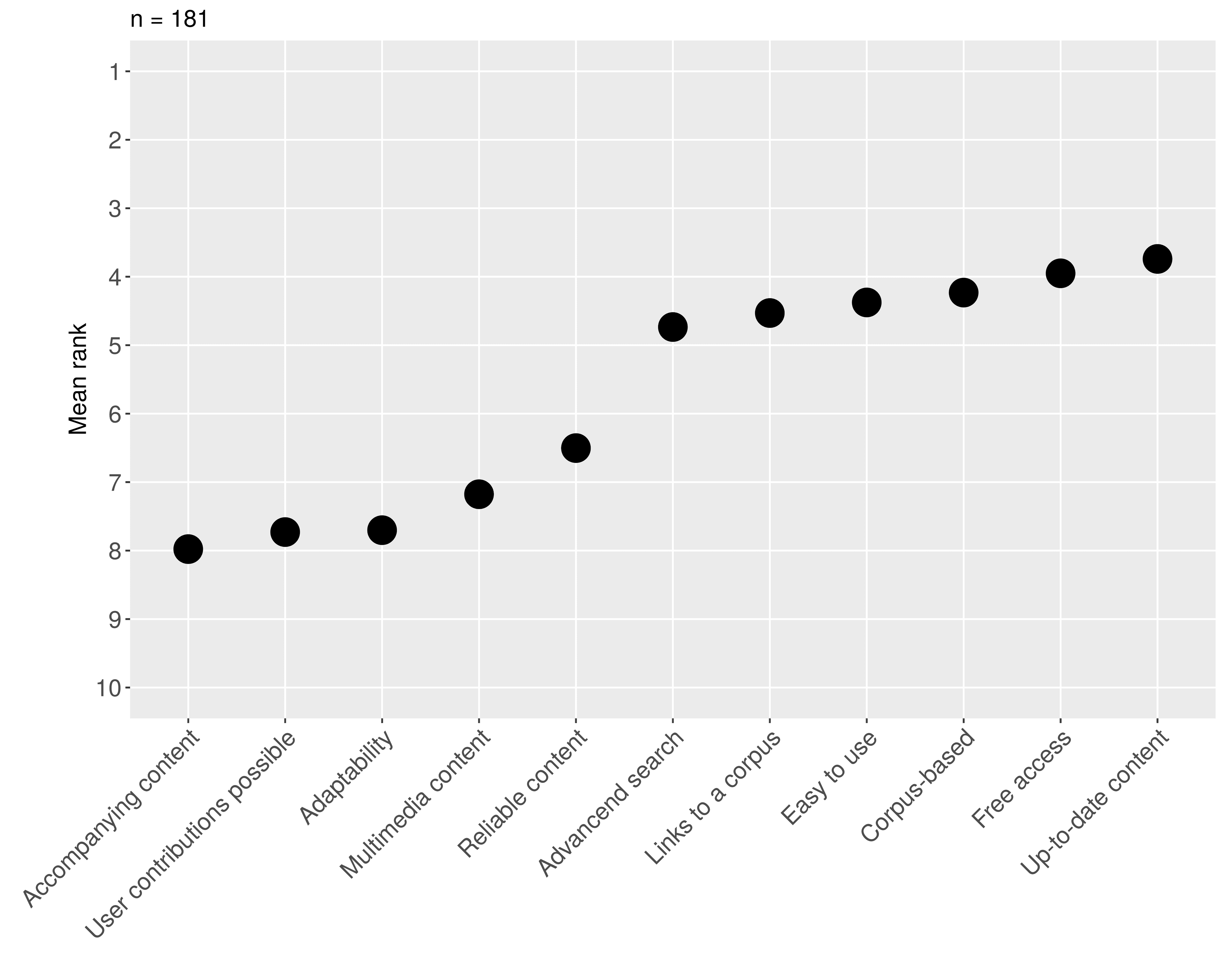 One of the questions excluded from above-mentioned comparison was a question on preferred characteristics of a monolingual dictionary. Overall, the users from different countries mainly share preferences, with reliable content being ranked as the most important feature, followed by up-to-date content, ease of use, and free access. However, there are countries such as North Macedonia that considerably deviate from the European average; as shown in Figures 3 and 4 below, North Macedonian dictionary users valued reliability of dictionaries much less than several other features.