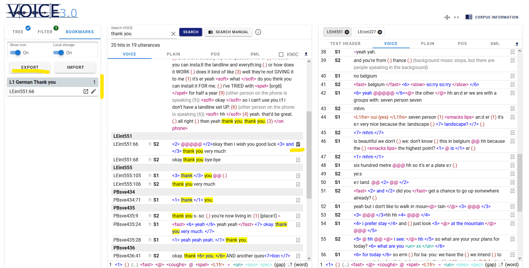 As an entirely novel feature of VOICE 3.0 Online, conversational mark-up can now be searched for and retrieved in different ways in the new interface. Users can: